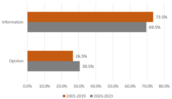 Finally, the way the units are covered based on the COVID-19 timeframe has also been analysed. In Figure 8, a different trend can be observed from one period to the next, with a downward line for Information and an upward line for Opinion.