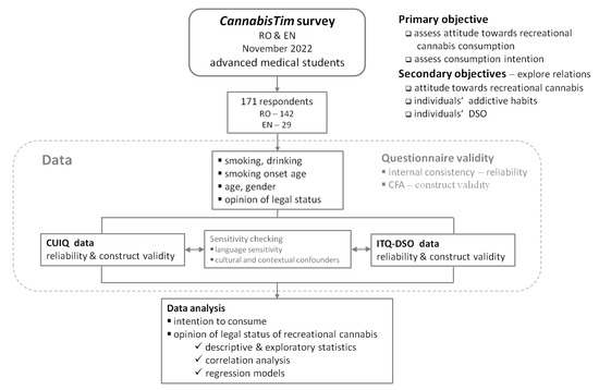 The project’s questionnaire is available in full in the Supplementary Materials. It included: Cannabis Use Intention Questionnaire (CUIQ), International Trauma Questionnaire—DSO (ITQ-DSO), International Trauma Exposure Measure (ITEM), and personal preferences/opinions/habits and socio-demographic questions. Figure 1 presents the study flow diagram, illustrating the distinct investigation stages.