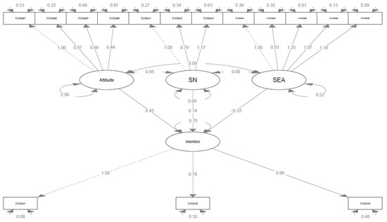 The covariance of the CUIQ model’s latent variables (factors) showed that attitude and SN were significantly interdependent, and they both significantly contributed to the intention to use (regressions in Table 3). SEA showed a highly significant negative contribution to the intention to use (regressions in Table 3); on the other hand, there seems to be no relation between SEA and SN or attitude (covariances in Table 3).