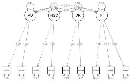 First-order four-factor CFA model for DSO scale (N = 171). Latent variables (factors) are in ovals and manifest variables (indicators) are in squares. Arrows from each factor to corresponding indicators show the factor loadings with the first indicator’s loading set to 1 (reference by default). Double arrows within and between factors indicate the residual variance and covariance, respectively. The values relevant to the present investigation are explicitly shown in Table 6. Abbreviations: AD, affect dysregulation; CFA, confirmatory factor analysis; DR, disturbances in relationships; FI, functional impairment; NSC, negative self-concept.