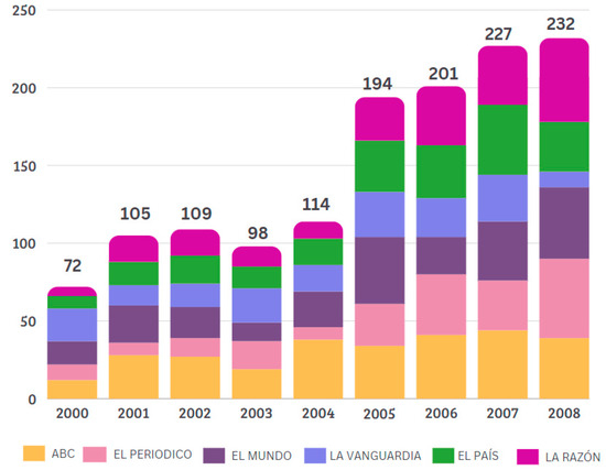 The selected media were the written press newspapers that are most widely read in Spain, both during the period analyzed and at present. Thus, they are the following: El País (785,000 daily readers of the print edition in 2022), La Vanguardia (472,000 readers), ABC (444,000 readers), El Mundo (436,000 readers), El Periódico de Cataluña (386,000 readers), and La Razón (350,000 readers) were complemented with a brief approach to the free and local press.