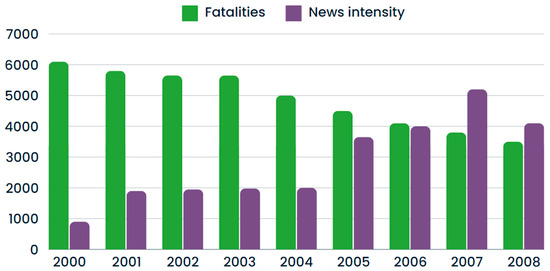 The most striking thing that can be observed in our data is that there is a pronounced increase in the number of news items, as well as in their intensity and tone of message. In other words, there is an increase in the use of terms with a greater component of aggressiveness or violence. These factors are fundamental to achieving an impact on the population and, thus, a greater recall and even a change in their behavior [66]. Conveying a clear and informative message is important, but including an emotional component is directly related to the effectiveness of reducing traffic accidents [67]. Research has shown that awareness campaigns that incorporate emotional elements, such as fear or empathy, have a significantly greater impact on the target audience [68]. When people are emotionally moved by a message, they tend to remember it longer and are more inclined to take preventive measures [68].
