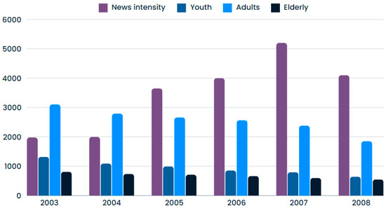 Our analyses indicate that there is a negative correlation between the number of news items and their intensity in relation to traffic accidents and deaths resulting from them. However, it should be made clear that Pearson’s correlation does not establish causality [78]. In addition, the fact that no substantial differences in the influence of print news by age group are identified is an interesting finding that contradicts expectations based on previous literature [79]. Traditionally, it has been assumed that young people reading fewer print media would be less influenced by print news compared to other age groups [80,81]. One possible reason is related to the fact that, although young people access less news through print newspapers, they have access to the same news through other media. In the years analyzed, news spreads rapidly and is available on a variety of platforms, including digital versions of newspapers, news websites, and social networks [82]. Therefore, even if young people do not actively consume print newspapers, they are likely to be exposed to the same news through other channels [83].