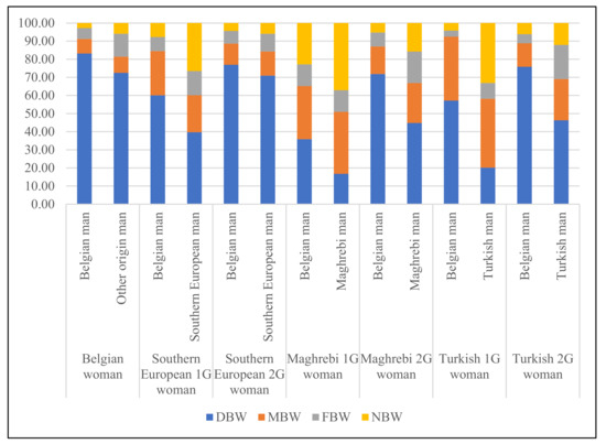 Given the higher levels of unemployment and employment instability, we would expect to find a higher proportion of women of Maghrebi or Turkish origin in couples where one or both partners are unemployed, particularly when both partners are of the same origin. The more disadvantaged position of non-European origin women is expected to reflect on the division of paid labour within households. Women of Maghrebi or Turkish origin in particular are expected to live in male breadwinner households more often compared to the other origin groups. Alongside these socioeconomic elements, the gendered division of paid work is also affected by sociocultural factors such as gender role attitudes and selective migration mechanisms. Given a more persistent gender gap in labour market participation among non-European origin groups, gender role divisions in paid and unpaid work may not have been challenged to the same extent compared to native Belgian and European origin groups. Previous studies indicate a higher preference for a gendered division of tasks among the Turkish and Moroccan first and second generations in Belgium [16,17,18] and other European countries [17,54,55,56,57]. However, gender role expectations are generally found to vary by gender and partner choice. Several studies have shown that the choice of higher educated second-generation Turkish and Moroccan women to marry a partner from their country of origin can be motivated by more gender egalitarian goals [31,58]. Given that local second-generation men are regarded as “too traditional”, a higher educated and possibly more progressive partner is preferred. In contrast, the choice of a second-generation Turkish or Maghrebi man to marry a first-generation partner of the same origin often confirms the male breadwinner and female caretaker roles given the more limited employment opportunities of first-generation non-European women [16,58]. Whereas these sociocultural elements are broadly studied among Maghrebi and Turkish origin groups throughout Europe, similar studies on the gender role attitudes of Southern Europeans are currently lacking in the literature.