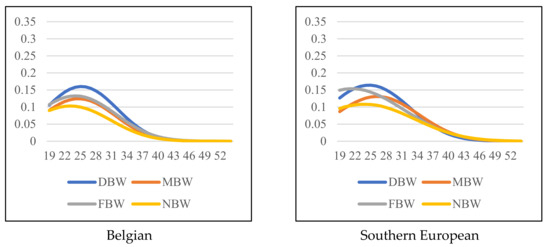 First, the percentage of women with a migration background who are in a dual-earner couple is remarkably higher when they are in a partnership with a Belgian man. The large differences in employment opportunities between Belgian men and non-Belgian origin women found in the Belgian labour market do not seem to lead to a higher percentage of male breadwinner couples. Instead, these results suggest that choosing a Belgian partner may be selective on socioeconomic characteristics such as educational level [28,30]. In combination with the high employment prospects generally found among Belgian men, this would increase the couple’s possibilities to attain a dual-earner model. Consequently, Turkish and Maghrebi women with a Belgian partner are potentially more likely to delay entry into parenthood due to more positive employment prospects. Among Southern European second-generation women, differences in the percentage of dual-earner couples are limited, indicating less differentiation in the ability to enter the labour market and less selective partner choices.