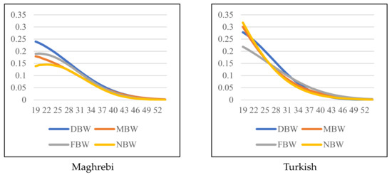 Considering the descendants of immigrants, the fertility behaviour of European origin groups mostly resembles that of the native population, whereas more substantial differences remain among non-European second-generation women. In Belgium, several studies indicate that Moroccan- and Turkish-origin women, in particular, enter into parenthood at earlier ages compared to the native Belgian population [12,60]. The study by Kulu, Hannemann, Pailhé, Neels, Krapf, González-Ferrer, and Andersson [59] indicates that first-birth risks are somewhat higher for the Turkish second generation but not for the Moroccan or Italian second generation while controlling for age and cohort differences. However, first birth risks become more similar after controlling for educational level.