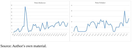 In November 2022, this research began collecting data on these accounts on the TikTok platform. The variable “followers” is a metric that can only be obtained by constantly monitoring the account month by month, as no marketing company can find out what the number of followers was in a particular month in the past on TikTok. It can only be known in the present, at the time the data are requested. Thus, in this research, it was possible to find out what the data were in November 2022 because the study was started at that time. Table 1 shows the development of the acquisition of followers, and it is striking that although Mediawise started earlier on TikTok, its number of followers in November 2022 was very low (24,900 followers). This is not the case for Politifact. On this date, they already had 155,900 followers. This figure was mainly reached between the end of 2021 and the end of 2022, as their activity, as will be seen below in the number of publications, became regular during the summer of 2021. However, in just one year (from November 2022 to November 2023), Mediawise grew to 155,200 followers, i.e., an increase of 523.29%. This rate has been decreasing in the most recent period, with a growth rate of 1.10% from November 2023 to January 2024. The case of Politifact is different. It showed a rapid rate of follower acquisition during 2020 and 2021, but in 2023, it seems to have slowed down. Thus, this account has had difficulty in acquiring a new audience in recent months.