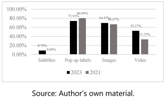 In the case of MediaWise, pop-up labels were used to emphasise the text, but subtitles were rarely used, as shown in Figure 4. MediaWise also relied on the use of images and videos to support their narrative, choices that followed an upward pattern in 2023. However, MediaWise did not show major differences between the resources used in 2021 and 2023.