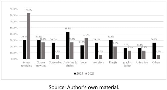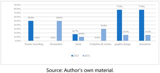 Politifact, however, does not use many of the above-mentioned didactic resources to verify its content. For example, screenshots were used in only 50% of the posts in 2021 and screen recording in 50% of the posts in 2023 (Figure 6). On the other hand, the use of animations and graphic design resources stands out.