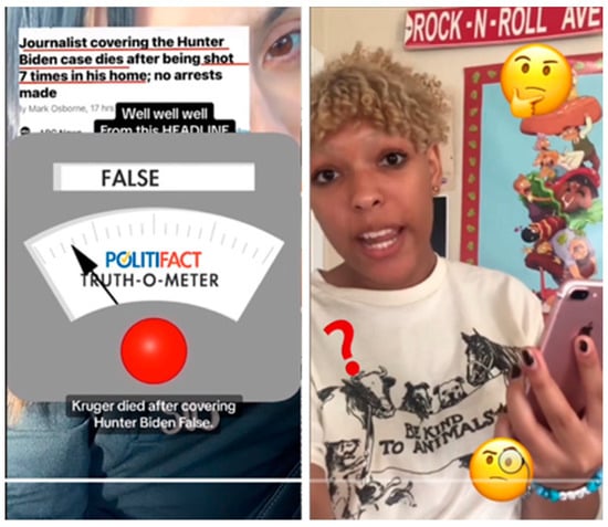 - Sidorenko-Bautista, P.; Alonso-López, N.; Giacomelli, F. Fact-checking in TikTok. Communication and narrative forms to combat misinformation. Rev. Lat. Comun. Soc. 2021, 79, 87–113. [Google Scholar] [CrossRef]
