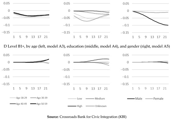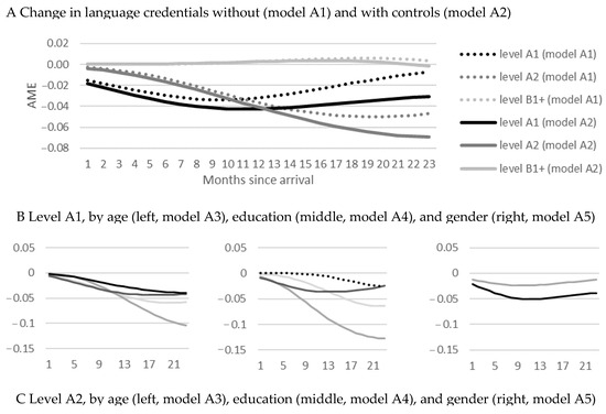 With respect to differential changes over the onset of the COVID-19 pandemic, depending on refugees’ age at arrival, level of education at arrival, and gender (Figure 1B–D), the results indicate larger differentiation in the change by gender (Δ−2LL: 299.89; Δdf. 6; p < 0.000) and level of educational attainment (Δ−2LL: 394.06; Δdf. 18; p < 0.000) than age at entry (Δ−2LL: 72.69; Δdf. 18; p < 0.000). Differentiation by age is limited to inconsistent differentials in attaining B1+ level credentials for refugees who have been residing in the country for a longer period only, extremely limited differentials regarding A2 level language credentials, yet also a more attenuated negative change in A1 level attainment over the onset of the pandemic for 18–29 and particularly 20–29-year-olds at arrival. Consequently, the hypothesis that younger refugees are less susceptible to changes in formal language acquisition is rejected (Hypothesis 2).