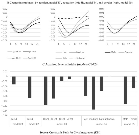 As the COVID-19 pandemic has presumably complicated host country language acquisition amongst refugees [15], yet such assumptions have hitherto not been confronted with data, this study is the first to empirically assess COVID-related shifts in the acquisition of language credentials. The first and foremost finding of this study is that refugee cohorts entering the country after the onset of the pandemic exhibit lower credentials compared to their counterparts before the onset of the pandemic. This finding confirms theoretical expectations based on reduced opportunities and incentives. In addition to potential limitations before migration (e.g., language training in the home country), language acquisition after migration has been limited in social settings due to COVID restrictions, in economic contexts as a result of economic shrinkage and remote working, and in formal structured language acquisition was less available due to cancelations or digital organisation [15,16,17]. Furthermore, this study indicates that low enrolment hazards and a lower intake level of proficiency are to be held responsible for generally lower levels of language credentials, rather than changes in progress after starting course participation.