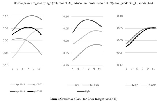 In line with the main results, COVID-related penalties in terms of progress after enrolment occur amongst younger age categories only (Δ−2LL: 75.57; Δdf. 6; p < 0.000) (Figure 3B). Regarding educational attainment, in line with expectations as well as aforementioned education-specific results in terms of language level and programme enrolment, negative effects of the onset of the COVID pandemic in terms of progress since the start of enrolment into language programmes do not occur amongst highly educated refugee groups, which contrasts with a particularly pronounced COVID-related penalty amongst medium level educated, and mixed effects amongst low educated refugees (Δ−2LL: 64.14; Δdf. 4; p < 0.000). Finally, in line with the aforementioned results indicating a more limited negative impact of COVID on formally recognised language acquisition amongst female refugees, the positive shift in progress after starting enrolment in language classes is marginally stronger for women compared to men (Δ−2LL: 6.96; Δdf. 2; p < 0.05).