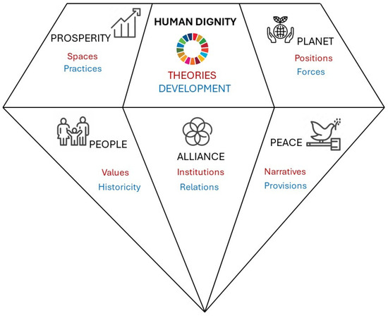 Therefore, this article focuses on three focal elements—human rights, Agenda 2030, and territories—considering the so-called five dimensions of Agenda 2030—People, Prosperity, Planet, Alliances (or Partnerships), and Peace—which are known as the five “Ps” that structure the SDGs, as represented in Figure 1.