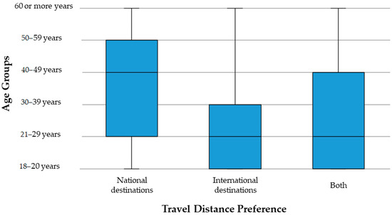 To describe and analyze the variables of the travel distance preference and preferences for the type of destination regarding age groups, a box and whisker plots were created, and these plots allow us to evaluate the first, second, and third quartiles, the median corresponding to the second quartile, or the fiftieth percentile (p50).