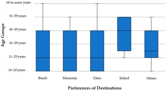 The box and whisker plots that relate the variable of age groups to the variable of the preferences for the type of destination (Figure 2) show uniformity in the medians corresponding to the 21–29 age group in choosing beach destinations, mountain destinations, and city destinations. Additionally, the median for inland destinations corresponds to the 40–49 age group. The median corresponding to other destinations is also associated with young individuals. Above the 75th percentile (p75), whiskers were found in all the boxes except for the one corresponding to inland destinations. Below the 25th percentile (p25), whiskers were found in the boxes of inland destinations and other destinations. Finally, it should be noted that a lack of normality was found, except for the box of inland destinations and the box corresponding to other destinations, with a relatively symmetrical distribution of the median.