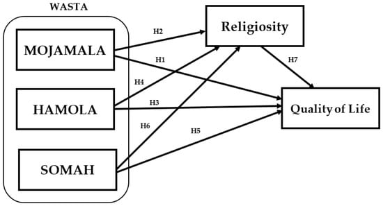 Religiosity and the evaluation of one’s well-being, happiness, and satisfaction in various life domains are two significant concepts that have received extensive attention across different cultures and contexts [35]. Religiosity refers to the level of dedication, belief, and engagement in a specific religion or faith [51]. Quality of life concerns the subjective evaluation of people’s general circumstances of well-being. Both religiosity and quality of life are influenced by a range of factors, including personality, culture, environment, and social support [52]. Within Islam, religiosity and quality of life are intricately intertwined and mutually reinforcing. Islam encompasses a comprehensive way of life, offering guidance for all facets of human existence, including worship, morality, ethics, law, education, health, and social interactions. It encourages Muslims to express gratitude to God for His blessings, to find contentment in His decrees, and to seek His assistance during times of hardship and adversity. Islam also promotes the pursuit of excellence and balance in worldly and spiritual matters, emphasizing the need to harmoniously address material and spiritual needs [53]. Furthermore, Islam advocates for principles of justice, compassion, generosity, and solidarity among individuals, irrespective of their faith, race, or nationality. It underscores the concept of tawhid, which highlights the unity of God and His creation, fostering respect for the diversity and dignity of all living beings. As a result, Islam provides a holistic framework for cultivating religiosity and enhancing the quality of life experienced by individuals [54]. Hence, we can propose the following (as seen in Figure 1):