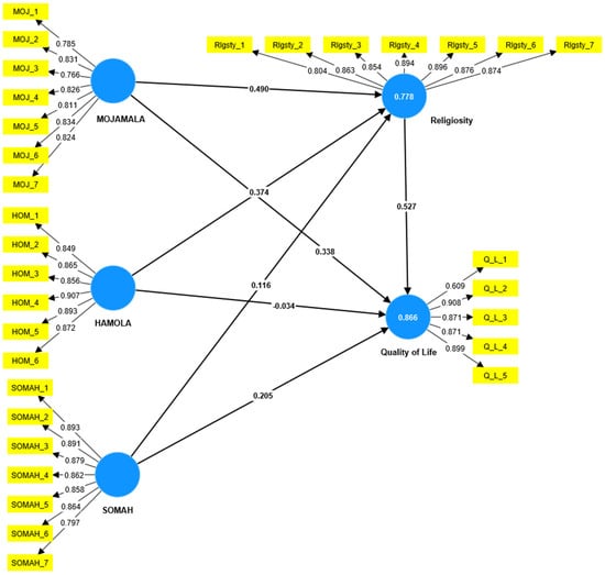 Surprisingly, the results of H3 showed a non-significant negative relationship between HAMOLA and QoL among the research participants (β = −0.034, p = 0.360), with a t-value below 1.96 (0.916) and a small effect size (f2) of 0.003 based on Cohen’s [65] standards and supporting the rejection of the alternative hypothesis. Regarding (H4), which investigated the correlation between HAMOLA and religiosity, the outcomes indicated that there was a significant positive link (β = 0.374, p = < 0.001). Table 5 also demonstrates the effect size (f2) of the association between HAMOLA and religiosity, which is 0.237, confirming the presence of a medium effect based on Cohen’s [65] standards. Additionally, the t-value for the relationship between HAMOLA and religiosity was adequate at 7.184, confirming the acceptance of the H4 hypothesis. H5 aimed to examine the relationship between SOMAH and QoL. The results showed a significant and positive link (β = 0.205, p < 0.001). Furthermore, Table 5 shows the effect size (f2) of 0.207, indicating the presence of a medium effect, according to Cohen’s [65] standards. Moreover, the t-value (t = 8.695) for the relationship between SOMAH and QoL implies a strong and significant association, supporting H5. In relation to H6, which intended to investigate whether SOMAH could affect religiosity, the results demonstrated that SOMAH had a positive significant impact on religiosity (β = 0.116, p < 0.001, t = 3.571) with a small effect size of (f2 = 0.042), supporting H6. Furthermore, the PLS-SEM output indicated a strong positive significant impact of religiosity on QOL (β = 0.527, p < 0.001, t = 11.911), with a large effect size (f2= 0.459), accepting H7.