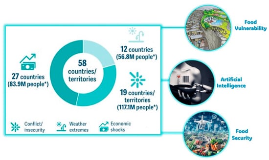 The factors mentioned above were important in the increase in global food vulnerability; however, there are other factors that are not mentioned but require special attention, such as the loss of biodiversity. Biodiversity experts estimated that approximately 30% of species have been globally threatened or driven to extinction since the year 1500 [] and structural adjustment policies that affect family farming [,,,]. The elements discussed above demonstrate that food vulnerability has progressively increased []. In today’s world, the interplay between social metabolism and the interactive effects of socioecological systems has added complexity to the global food reality []. In this context, the use of artificial intelligence (AI) can provide an analytical alternative not only to understand this reality but also to propose solutions []. AI has a crucial role in food security. It can analyze climate data to predict extreme weather events and create early warning systems [], enabling a rapid response to threats such as pests or diseases affecting crops. This facilitates the implementation of preventive measures, reducing the impact on agriculture and improving food security. AI also optimizes farming practices by analyzing soil, climate, and crop data and making recommendations to improve efficiency and productivity []. It also monitors biodiversity and its impact on ecosystems [], understands how conflict and economic shocks affect rural communities, and helps design specific support policies []. In addition, it improves the ability to respond to food crises by identifying areas of scarcity and facilitating the efficient distribution of aid. In assessing structural adjustment policies, AI analyzes economic and social data, providing critical information to make informed decisions and minimize adverse impacts []. AI is an essential tool for achieving sustainability and resilience in food systems at the national and international levels, and its ability to analyze large amounts of data and provide precise recommendations can contribute to the sustainability, equity, and resilience of food systems at the national and international levels.