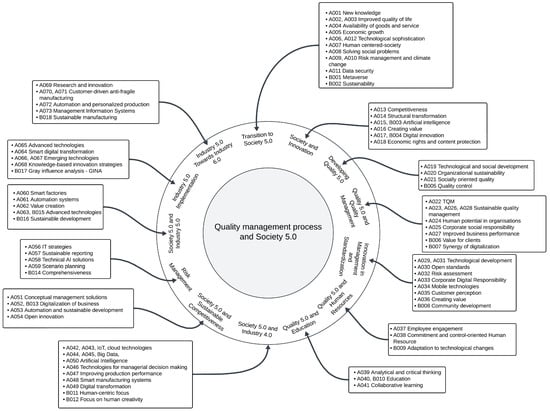 The core of the model is the “Quality management process and Society 5.0”. The evolution of society towards this new paradigm is deeply intertwined with advancements in quality management processes. Society 5.0 refers to a human-centered society that balances economic advancement with the resolution of social problems.
