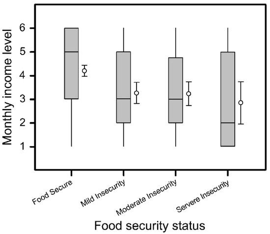 Boxplots of monthly income (ordinal) for the students belonging to the four security categories: Food Secure, and Mild, Moderate, and Severe Food Insecurity. The mean value, with its 95% confidence intervals, is displayed to the right of each boxplot. On the y-axis, the lowest (1) and highest (6) income levels correspond to <4000 SAR and >15,000 SAR per month. (See Supplementary Table S1 for the other income intervals). From left to right, the sample includes 206, 69, 44, and 19 students, respectively, at King Abdulaziz University (Jeddah, Saudi Arabia).