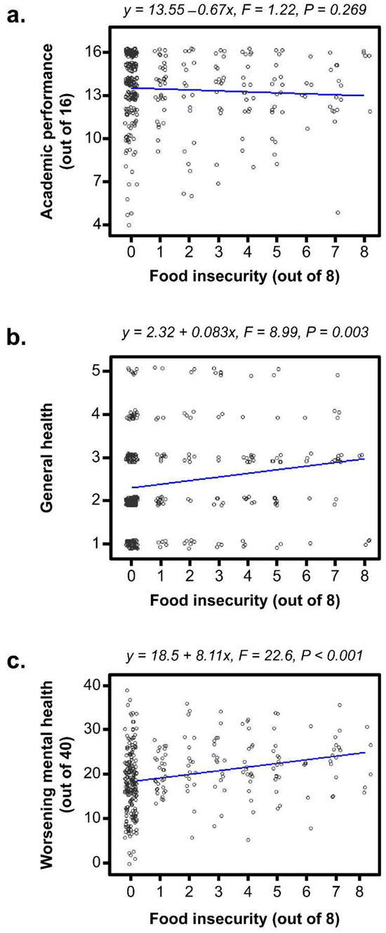 We fit bivariate linear regressions to the data to further examine and quantify the relationships of food security with the academic performance and health of the participants. Figure 3 shows that there was extensive scatter (“noise”) in the data for all three relationships (all adjusted R2 values < 0.061). The academic performance of the students hardly changed with their food security (a slope near zero: –0.067, adj. R2 = 0.001; Figure 3a). In contrast, the physical (i.e., positive slope) (adj. R2 = 0.023; Figure 3b) and mental (adj. R2 = 0.06; Figure 3c) health of the students deteriorated with increasing food insecurity (p < 0.005).