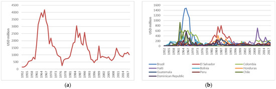 Evolution of USAID investments in Latin America: (a) total and (b) per country (1960–2019). Data source: [17].