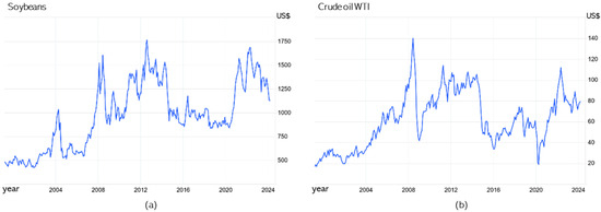 Historical evolution of the prices for soybean (a) and crude oil (b) in the last three decades, expressed in USD. Data source: [53].