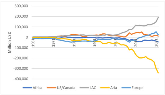 Trend of net exports of agricultural products by region between 1961 and 2022. Data source: [55].