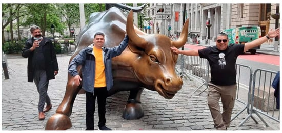 A tourist stops to take a souvenir photo with the Charging Bull of Wall Street. Source: https://www.thewallstreetexperience.com/blog/how-to-pose-at-the-charging-bull-9-tips-for-the-best-photo/, accessed on 30 March 2024.
