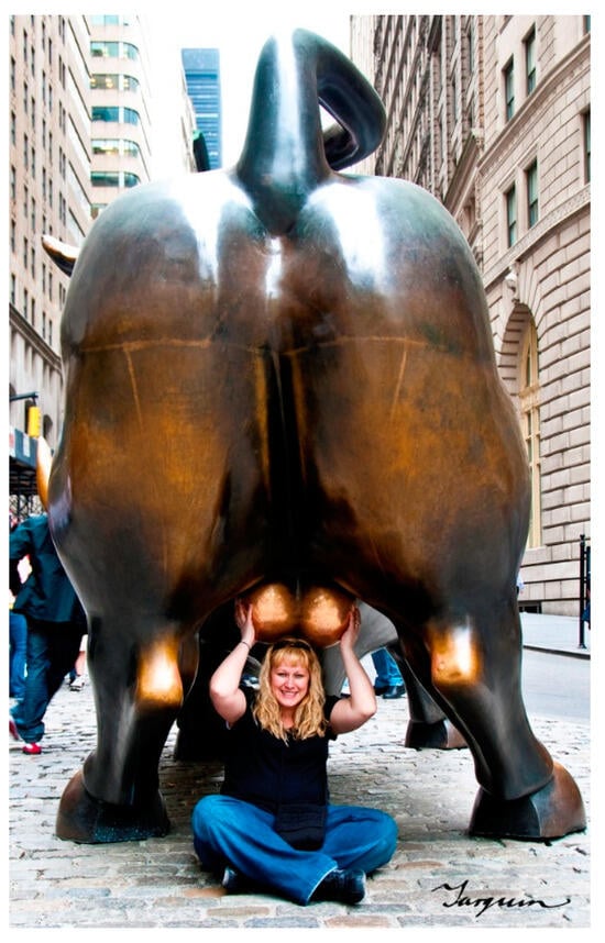 A woman grabs and rubs the Bull’s Balls. Source: https://steemit.com/art/@goldenarms/the-charging-bull-a-lil-history-and-some-people-touching-it-s-balls, accessed on 30 March 2024.