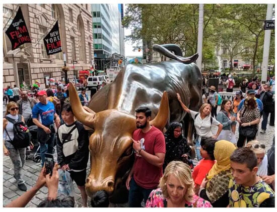 Using the general framework of symbolic interactionism, our research aims to study a different aspect of the statue to the past literature. Earlier research tended to focus on the symbolic meaning of the Charging Bull of Wall Street after the 1987 stock market crash (e.g., []). Later, during the Occupy Wall Street movement, the statue took on another meaning as the financial district totem of testosterone and became the activists’ meeting place [,]. Direct confrontation with the Bull came in 2017, when the Fearless Girl statue was installed opposite the Bull, seeking to champion gender equality and challenge the male-dominated financial industry, drawing attention to the gendered nature of power dynamics and raising issues about the battle surrounding integrity, moral rights, and freedom of expression [,,], although it was relocated elsewhere when the Bull’s artist argued that the Girl statue altered the perception of his artistic creation. In this paper, we ask a different question: how do ordinary people, i.e., visitors to New York City, interact with the Charging Bull statue?