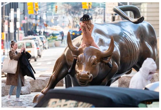 The Charging Bull statue goes beyond the traditional role of statues as mere symbols and embodies the concept of the invention of tradition. There are other forms of unexpected interactions that have not become a tradition but still occasionally occur. In other words, taking a souvenir shot, posing by imitating the statue (as in participating in action), and public-made symbolism are all routinely performed on a regular basis. There are still occasional different ways of interacting with a statue, and we term these as “unexpected interactions.” One such example is observed when a nude woman wearing a cowgirl hat actively engaged with the statue by straddling the Bull (Figure 5). While riding on top of a statue might not be extremely rare, doing this in the nude was a totally unexpected behavior, challenging the status quo and the ongoing Coronavirus pandemic at the time. The action takes on a symbolic significance that becomes intertwined with the broader understanding of the statue’s meaning. The Charging Bull transforms from a representation of the financial industry into a symbol of resilience, empowerment, and individual agency through individuals’ performative behavior. The unexpected interactions that take place align with the principles of symbolic interactionism, which emphasize the role of social interactions in shaping individuals’ behaviors and constructing meaning. In actively engaging with the Charging Bull, individuals participate in symbolic interaction, utilizing the statue as a medium to negotiate and convey their ideas, emotions, and experiences.