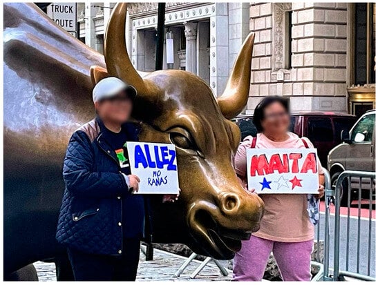 While the initial prediction was that tourists would have varying interpretations of the Charging Bull statue, the majority of participants expressed the view that the Charging Bull represented symbols of strength and wealth. On the day of the 2023 New York City Marathon, the first author observed that some of the tourists would pose with their signs supporting their runners who were part of the Marathon (see Figure 6). Posing with signs supporting marathon runners represents another type of interaction with the statue. A marathon is an endurance sport, and according to folklore, bulls symbolize endurance []. Therefore, it is not surprising to see marathon runners and supporters posing in front of the Charging Bull.