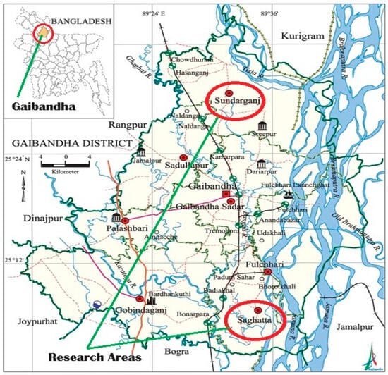 Information for this study was gathered in the following places: Sundorganj Upazilla and Saghata Upazilla (sub-districts) of the Gaibandha district (See Figure 2) in Bangladesh. These are rural areas where most people are farmers. The decision to focus on these places was inspired by discussions with staff members from the Department of Agricultural Extension (DAE) district offices and past research that revealed that these were the areas with the highest number of internal migrants. We searched household records at the Upazilla agriculture offices using a fixed sample size for data gathering. We found 11,300 farming households with one or more members who had left the area. Considering the time and budgetary constraints, we randomly chose (using the table of random numbers) 372 residences for phone interviews (the migrated persons) following the equation provided by [46]. We selected only migrated people because only they can understand the actual situation in urban areas and compare rural and urban life with those of other people living in villages [7].