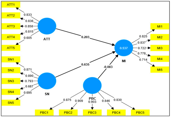 The findings of the validity and reliability studies are shown in Table 4. The results showed acceptable factor loadings, as no indication showed values below 0.605. Each construct had composite reliability and a Cronbach’s alpha of over 0.7, indicating the model’s reliability [55]. Every average variance extracted (AVE) value was more than 0.5; thus, convergent validity was shown. Further evidence that the ranged AVE values of all constructs were significantly higher than the minimal threshold value was provided by the fact that each latent construct had a squared root of AVE greater than its latent factor correlation [56]. This demonstrated the discriminant validity of the constructs. As stated, off-diagonal correlation values for the latent variable were lower than diagonal values (Table 5), indicating that both analyses were significant and confirmed the research hypotheses [57].