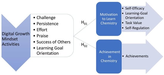 While substantial evidence supports the positive effects of a growth mindset on enhancing students’ motivation and chemistry achievement [], the literature reveals a notable gap in understanding the specific impact of a digital growth mindset. A digital growth mindset refers to the application of growth mindset principles through digital platforms and technology-enhanced learning environments. Previous studies have predominantly focused on traditional instructional settings, with less attention paid to how digital interventions could potentially amplify these effects. Consequently, there is a dearth of empirical data exploring how digital tools and resources designed to foster a growth mindset directly influence students’ motivation and academic performance in chemistry. This gap highlights the need for targeted research to ascertain the effectiveness of digital growth mindset interventions in educational settings. This study holds significance as it bridges a critical gap identified in the previous literature by examining the combined effect of a digital growth mindset on students’ motivation and chemistry achievement. Given the increasing importance of educational technology in modern learning, understanding the potential of digital platforms in fostering a growth mindset is crucial. Through the implementation of digital strategies that encourage a growth mindset, this study aimed to provide empirical validation for the development of more effective educational methods and tools. These findings have the potential to not only enhance student engagement and academic performance but also offer practical guidance for educators seeking to utilize technology to cultivate resilient and motivated learners. Ultimately, this research will contribute to broader educational conversations by providing evidence-based recommendations for improving student achievement through digital growth mindset interventions.