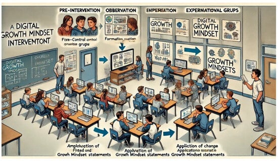 A wide variety of situations were presented to students, who evaluated the usefulness of a digital growth mindset in each scenario and drafted a digital growth mindset statement to aid them in such situations. For example, a student might conclude that a digital growth mindset would be beneficial in motivating them to improve their performance or seek assistance from a friend if they received a lower grade on an assignment than their peers. Other instances related to various aspects of a student’s life, such as their sports team or family at home. The classroom provided an authentic digital growth mindset environment during the intervention exercise through the display of motivational messages on the bulletin board and wall charts, as well as the teaching of intervention strategies. Figure 2 has been generated using an AI tool which shows the procedure for a digital growth mindset.