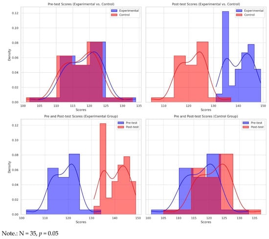 Figure 7 shows that the mean increased from 118.31 (pre-test) to 140.34 (post-test) in the experimental group, while the mean increased slightly from 117.31 (pre-test) to 121.31 (post-test) in the control group. The t-statistic: 0.73, p-value: 0.47 indicated no significant difference between the groups before the intervention. While the t-statistic: 14.80, p-value: <0.001 indicated a significant difference in favor of the experimental group post-intervention. The t-statistic: −17.75, p-value: <0.001 showed a significant result indicating improvement within the experimental group. The Cohen’s d value was calculated as d = 4.10. The 0.70 < 4.10 effect size can be assumed as a strong effect [].