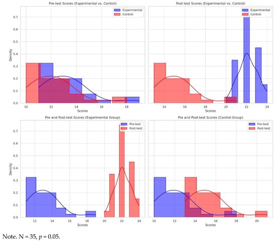 Figure 8 shows that the mean increased significantly from 13.29 (pre-test) to 22.17 (post-test) in the experimental group, while in control group, the mean changed from 12.29 (pre-test) to 15.29 (post-test). The t-statistic: 2.27, p-value: 0.026 indicated a statistically significant difference even before the intervention, with the experimental group scoring slightly higher. The t-statistic: 19.65, p-value: <0.001 indicated a significant difference in favor of the experimental group post-intervention, suggesting substantial effects from the intervention. The t-statistic: −24.74, p-value: <0.001 indicated a substantial improvement within the experimental group. The Cohen’s d value was calculated as d = 6.06. The 1.63 < 6.06 effect size can be assumed as a strong effect [].