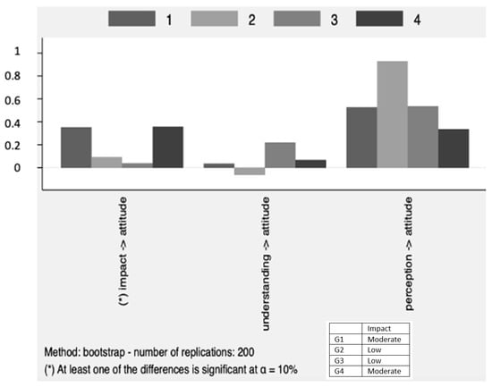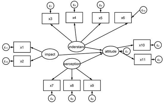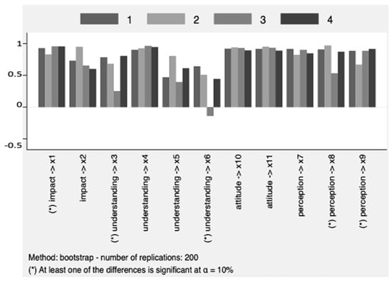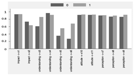 Table 8 presents the cross-loading coefficients of the observed variables on the latent variables of the model (Equation (4)). Significant coefficients are observed in various cells, indicating the strength of the relationship between the observed variables and the corresponding latent variables. For the latent variable “impact”, the observed variables x1, x4, x10, and x11 show notable cross-loading coefficients, with values of 0.9356, 0.3718, 0.5955, and 0.5689, respectively. This suggests a significant influence of these observed variables on the latent variable “impact”. For the latent variable “understanding”, the observed variables x1, x4, x10, and x11 also show significant cross-loading coefficients, with values of 0.3564, 0.9184, 0.3579, and 0.3001, respectively. This indicates a strong correlation between these observed variables and the latent variable “understanding”. For the latent variable “attitude”, the observed variables x1, x4, x10, x11, x7, x8, and x9 exhibit significant cross-loading coefficients, suggesting a significant correlation between these observed variables and the latent variable “attitude”. Finally, for the latent variable “perception”, the observed variables x1, x4, x10, x11, x7, x8, and x9 also show notable cross-loading coefficients, indicating a strong relationship between these observed variables and the latent variable “perception”.