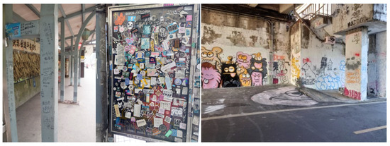 Figure 13). The dark surface also enabled a rich configuration and layout of graffiti, which reminded people of traditional creation environments and novel urban night landscapes.