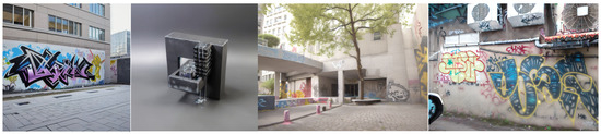 It seems that SD generates graffiti for all kinds of urban fabrics wherever an opaque and textured wall is located. Graffiti can be generated for small-scale urban scenes, too, but usually at a size too small to identify. For the best evaluation, sufficient space should be maintained for creation on the solid part of the building façade.