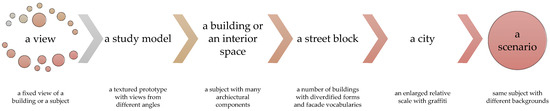 The test sequences started with the selection of representative source images and prototype and non-prototype urban fabrics, and then empty spaces were filled in with and without existing graffiti. The source images were selected from images of buildings with abstract pedagogical forms and compositions, field photographs, and images from competitions, with and without plain backgrounds. The selected non-prototype urban fabric was a campus scene and a city with a sequence of partially overlapping views constructed from an everyday walking and driving route.