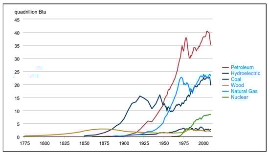 During this period, the international fossil fuel market expanded rapidly, matured, and stabilized, marking a clear transition into the “oil age” and definitively leaving behind the “coal age”. There was also a continued decline in the energy density of industrialized economies, reflecting the evolution of energy consumption in the US from 1775 to 2009 and showcasing the significant growth and stabilization of energy consumption patterns in recent decades (Figure 2) 2.