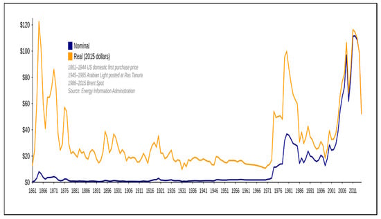 - File: Oil Prices Since 1861. Svg-Wikipedia. Available online: https://commons.wikimedia.org/wiki/File:Oil_Prices_Since_1861.svg (accessed on 22 July 2024).