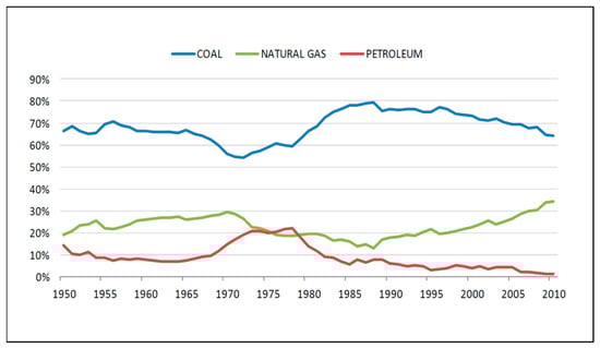 From 1980 to 2008, there was a relatively smooth transition of production and consumption capacities on a planetary level, alongside the emergence of the global climate crisis. During this phase, the international energy sector evolved quickly, significantly and steadily increasing the overall supply of primary energy from various sources [27,28]. This period saw a shift towards “less coal, more natural gas”, with a mild decline in energy consumption by volume. The changing contributions of coal, natural gas, and petroleum over time demonstrated ongoing efforts to reduce the carbon footprint of energy production (Figure 6).