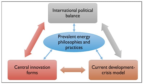 In conclusion, the post-WWII evolution of the global system through its different phases highlights the close interconnection and mutual determination of international politics, successive models of development-crisis, and innovation dynamics, with energy philosophies 4 and practices at the center. This interconnectedness is reflected by the complex relationships and feedback loops shaping the global economic and political landscape, particularly in the context of energy production, management, distribution, and use (Figure 8).