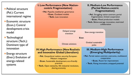In particular, based on these phases, the NGSM presents a matrix of potential future scenarios for the emerging new globalization. The matrix, depicted in Figure 9, is built upon the concept of new regionalization—which mainly means increased and reconfigured inter-regional collaboration for uneven globalization advantages [52]. The NGSM perspective categorizes four distinct scenarios by performance level (low, medium-low, medium-high, and high) within the four pillars of the political structure (Pol.), economic structure (Econ.), technological structure (Tech.), and energy structure (Ener.). The political structure represents the potency and effect of the current global order (international regime). The economic structure refers to the essence of the primary crisis-development model currently in use, the technological structure addresses the prevalent innovation style, and the energy structure pertains to energy-related evolutions.