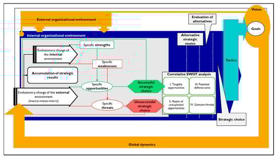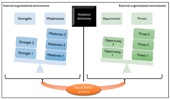 The conventional SWOT model, as criticized by Vlados [61], examines an organization’s internal and external environments independently. This approach encompasses all types and sizes of organization, from the smallest businesses to state and transnational entities. However, this isolated analysis of strengths, weaknesses, opportunities, and threats often leads to a fragmented understanding. It overlooks the comparative and relative aspects of these elements, resulting in significant gaps in the strategic planning process [64,65,66] (Figure 10).